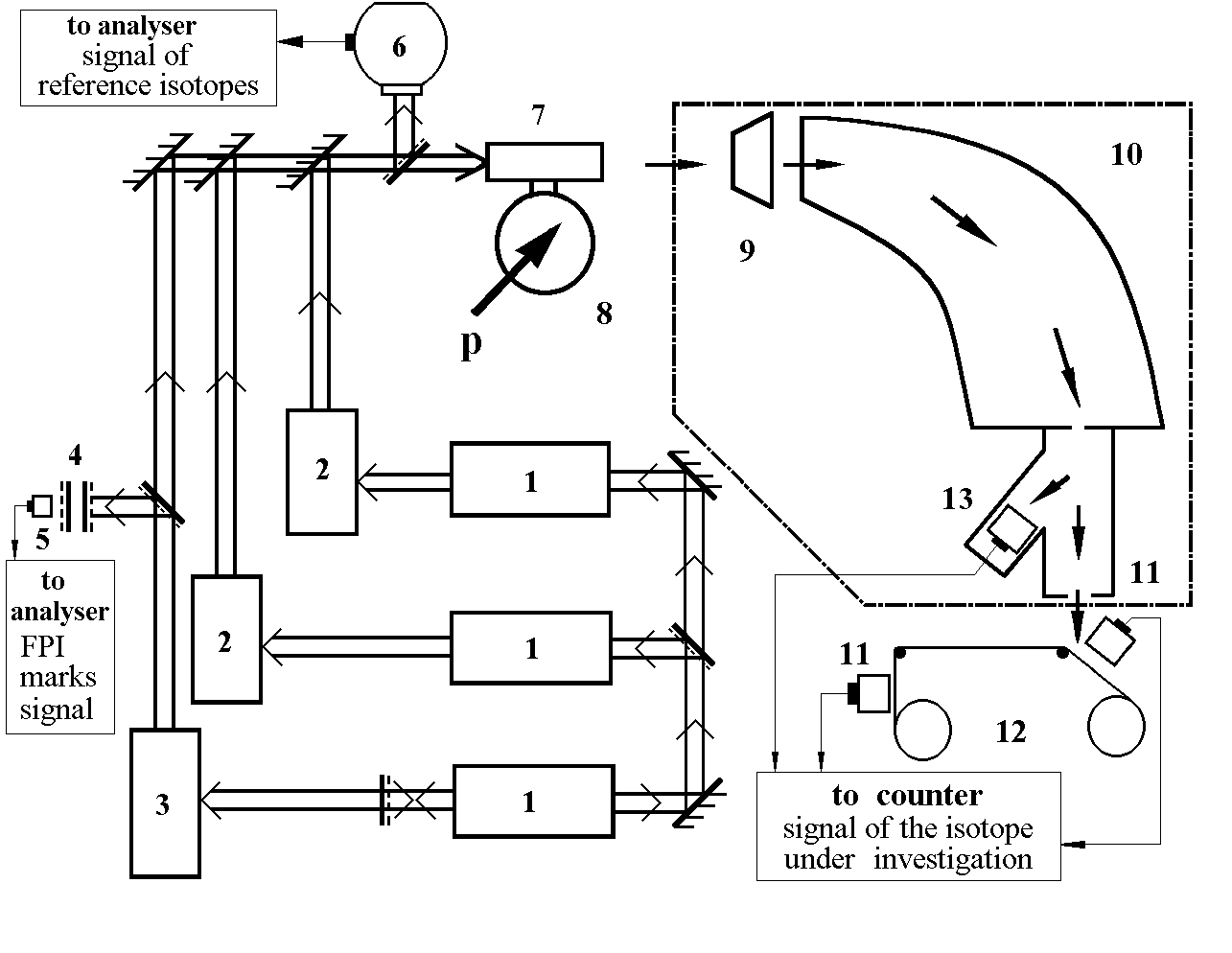 1 – Cu-vapour lasers; 2 – broadband dye lasers; 3 – narrowband scanning dye laser; 4 – Fabry-Perot interferometer; 5 – photodiod; 6 – reference chamber; 7 – laser ion source; 8 – target; 9 – extraction electrod; 10 – mass-separator; 11 – a-detectors; 12 – tape-driving device; 13 – electron multiplier.